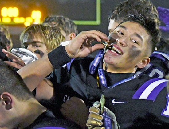 Cascade Christian quarterback Deryk Farmer bites his championship medal after the Challengers defeated Burns 35-28 to win the Class 3A football state championship game Saturday night at Summit High School in Bend. The victory gave the Challengers their third state title in four years and capped a perfect 13-0 2025 season.