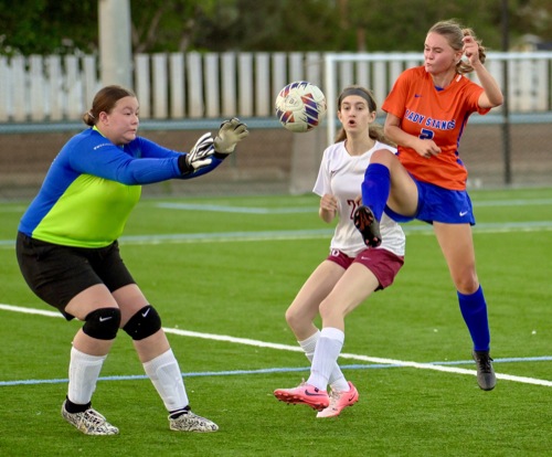 HV #2 boots the ball past NV goalie as NV #20 looks on. This was HV's first goal. HV wins it (it was 5-0 HV when I left)