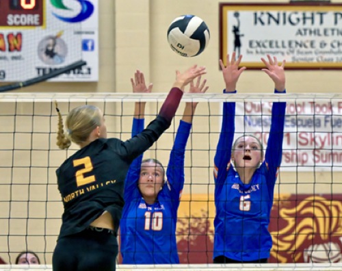 (L to R) NV #2, HV #10, HV #6 North Valley wins over Hidden Valley in 3 sets (25-23, 33-31, 25-14)