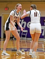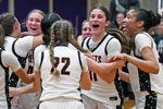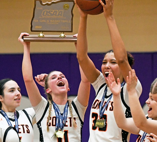 Crater players (from left) Jazmine Fernandez, Sage Winslow, Lydia Traore and Cameron Yohner celebrate with the state championship trophy after the Comets defeated South Albany in overtime to win the program's first state title Saturday at Linfield University in McMinnville.