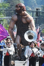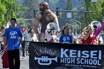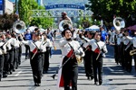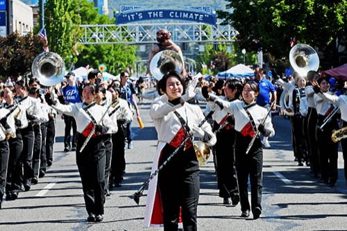 Keisei High School marching band drum major Mihiro Tominaga (center) waves to the crowd as she leads Keisei musicians down Sixth Street in Grants Pass on May 24 in the Boatnik Parade. The Keisei band was in Grants Pass as part of a cultural exchange program with Grants Pass High School bands.