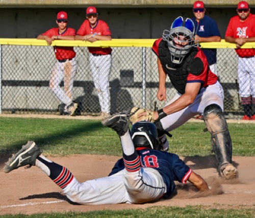 (7th inning) Nuggets catcher #13 completes a tag-out of Medford #18 at home plate...stopping the tie run attempt and ending the game Photos by Joel Takarsh