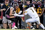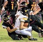 North Valley running back Gabe Dahlberg (22) outraces South Umpqua's Mason Johnson (6) and Rudolphe Vasquez (18) to the end zone in the third quarter to score the two teams' only touchdown of the game on Friday night in Merlin. North Valley won 6-3.