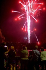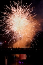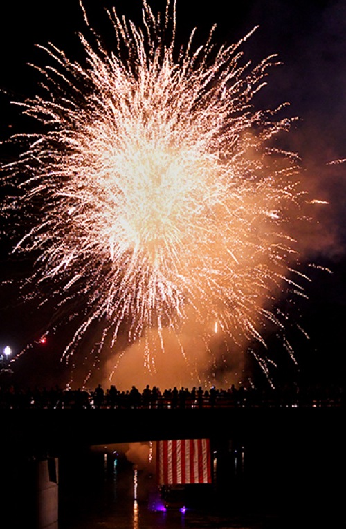 Spectators on the Seventh Street Bridge in Grants Pass watch the finale of the Boatnik fireworks show on Sunday, May 28, 2017. (Scott Stoddard / Daily Courier)