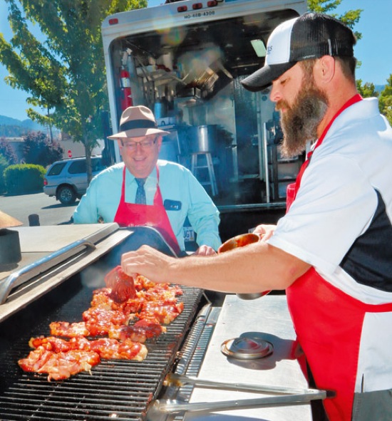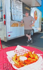Terall Blalock (left) started Papa Terall's BBQ & Catering food cart with son Jeff Darling many years ago. The father/son team barbecues on weekends but Terall still stops by on weekdays as he watches Darling cook up the day's chicken thighs in the parking lot behind the main post office. "We grill about 10 pounds a day," Darling said. "And another 100 pounds of pork butt a week that we use for both the truck and our catering business."