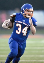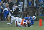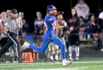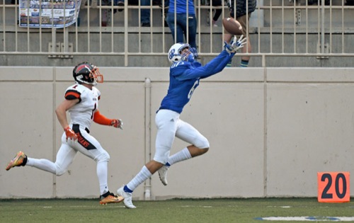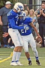 Grants Pass wide receiver Tayler Phillips outruns Roseburg's Garrett Russell and hauls in a long pass in the opening minutes of the Cavemen's 30-7 victory over the Indians at Mel Ingram Field on Sept. 15, 2017.