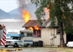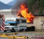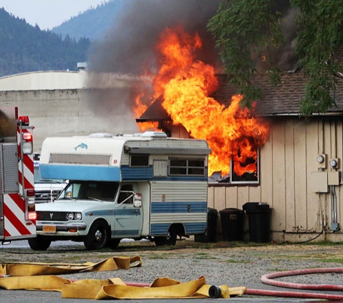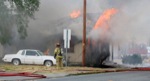 Flames shoot out of a residence and threaten a vehicle at 323 SE G St. on Monday afternoon. Fire crews managed to contain the fire to the structure, but the incident shut down portions of Ninth Street and G Street for hours.