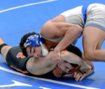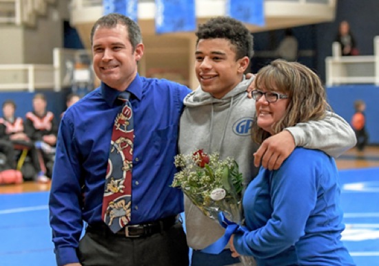 Photo by JOEL TAKARSH/for The Daily Courier PIC #0009 Senior recognition night / Vince Washington with wrestling coach and Vince's mom.