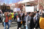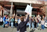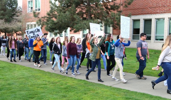 A small group of Grants Pass High School students gather around the school's flag pole to play guitar, sing and pray for peace and protection as about 300 others circled the campus for 17 minutes, chanting “Enough is enough,” “Books not Guns” and other messages protesting gun violence. A dozen police attended the event, which modeled others around the country at 10 a.m. The 17 minutes represented all the victims at the Parkland, Florida, high school mass shooting one month ago.