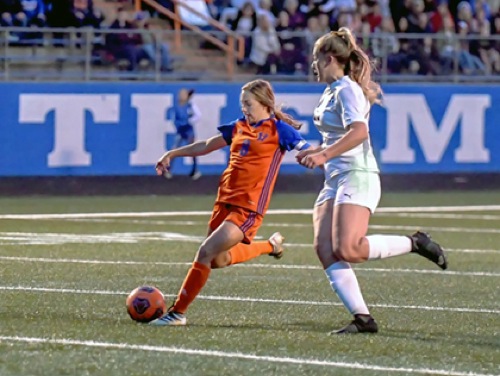 Photo by JOEL TAKARSH/for The Daily Courier, PIC #0673 HV #8, PHL #22 (HV #8 kicking HV's 2nd goal) Lady Mustangs advance!