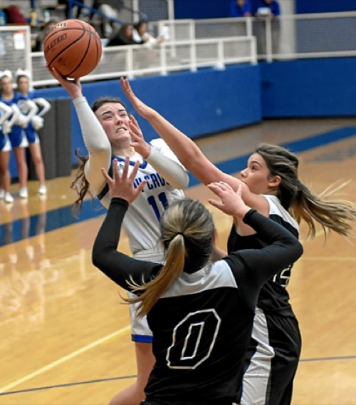 Photo by JOEL TAKARSH/for The Daily Courier, PIC #1053 (L to R) GP #11, SM #0, SM #2 Lady Cavers can't get the upper hand. Lose it 69-58