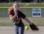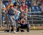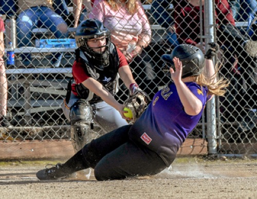 Photo by JOEL TAKARSH/for The Daily Courier, PIC #0546 NV catcher makes tag at home plate on El Mira #3 but the call is 'SAFE' Lady Knights lose it 12-3.