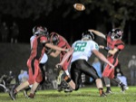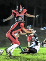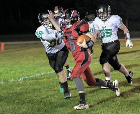 Photo by JOEL TAKARSH/for The Daily Courier PIC # 0825 GLND #16 on a QB keeper stiffarms RID #30 as RID #55 pursues
