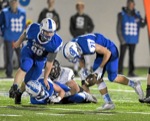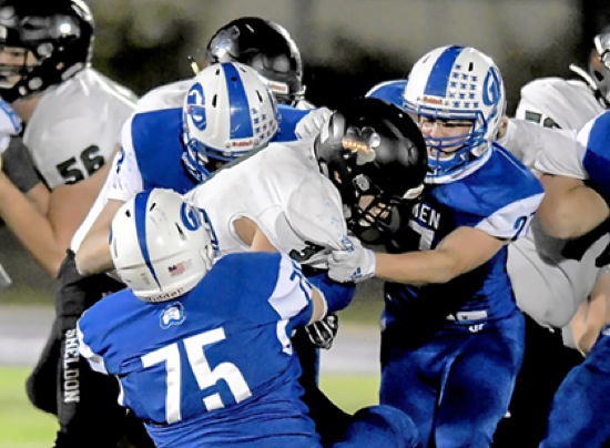 Photo by JOEL TAKARSH/for The Daily Courier PIC #0673 GP defensemen #75 and GP #27(right) bring down Sheldon #3