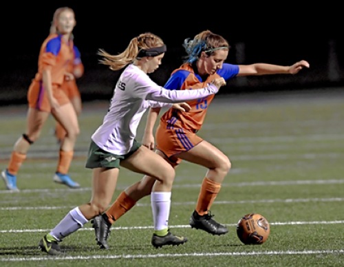 Photo by JOEL TAKARSH/for The Daily Courier PIC #0268 (L to R) NM #11, HV #15 Mustangs fall to North Marion 2-0