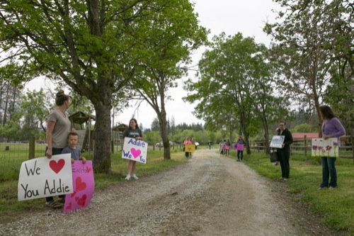 Friends and neighbors line the Kassab family's driveway in Hugo to wish them well before they leave for Seattle Children's Hospital on Saturday morning, April 25, 2020.