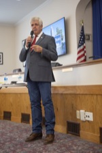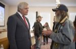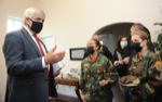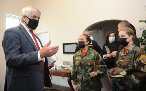 Representative Cliff Bentz (R-Ontario) speaks to members of the Rogue Valley young marines Peggy Edwards and Kayleigh Meyer before a town hall meeting in Grants Pass Wed. Nov. 10, 2021.