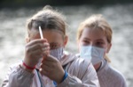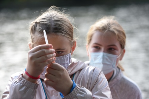Allen Dale student Katie Klein looks for bugs in a water sample as Kenley O’Brien looks over her shoulder during a field trip to the river at Reinhart Volunteer Park in Grants Pass Fri. Oct. 22, 2021.