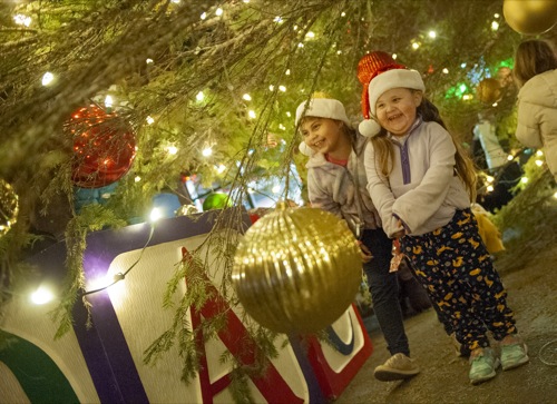 Sisters Aubree, 8, and Rayna Garcia, 3, of Grants Pass, admire the Christmas tree from underneath it, during the Christmas tree lighting event in Grants Pass Fri. Dec. 3, 2021.