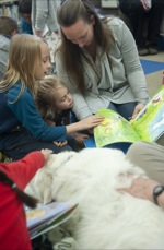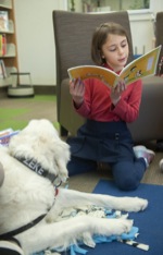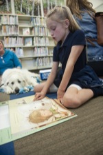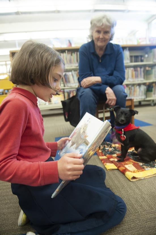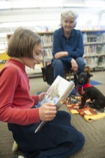 Maria Voehl, 7, of Grants Pass, reads to chihuahua/dachshund mix Kalen, 6, who was adopted from the Medford Humane Society by owner Patricia Wagner, in back, during the K9 Reading Program at the Josephine County Library in Grants Pass Tues. April 5, 2022.