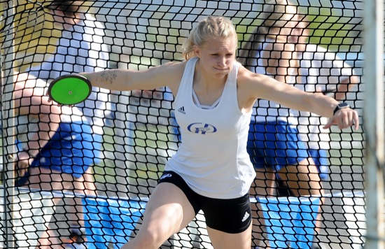 Grants Pass' Grace Osborne competes in the discus during the track and field competition at Grants Pass High in Grants Pass Wed. April 6, 2022. She was the champion of the event.