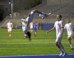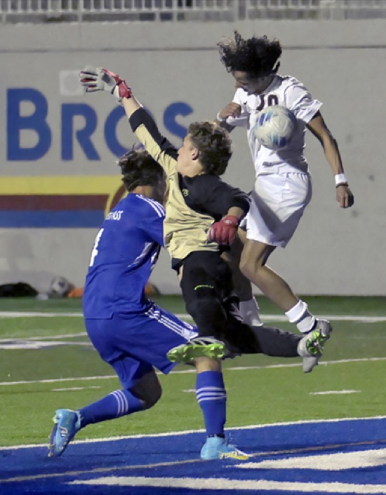 (L to R) GP #4, GP Goallie #00, NM #10 ...NM #10's header goes in for NM's second goal