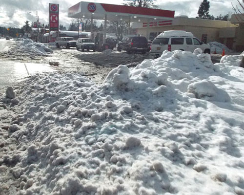 JEFF DUEWEL/Daily Courier More snow piled up next to the 76 station in downtown Cave Junction.