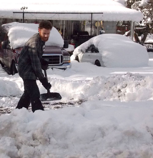 JEFF DUEWEL/Daily Courier Daniel Beckman shovels snow at his grandmother's house on South Junction Avenue in Cave Junction.