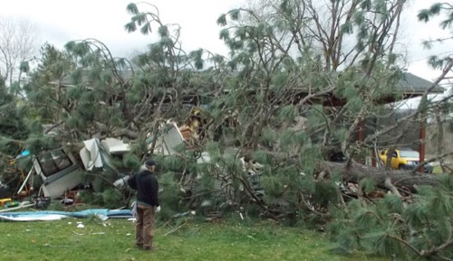 JEFF DUEWEL/Daily Courier Robert Ostoj surveys what is left of his fifth-wheel trailer that was crushed by an estimated 120-foot-tall ponderosa pine in a windstorm, as they slept Monday morning.