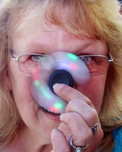 Suzie Wyatt, demonstrates one of the LED lit Fidget spinners she is selling at the carnival at Riverside Park over Boatnik weekend. "They are really calming," she said. "We've even had a psychiatrist buy a bunch to give out to his patients," she added.