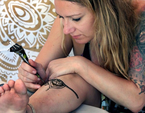 Gina Craig gives herself a temporary Henna tattoo as she waits for clients to her booth at the Davis Shows Northwest at Riverside Park. She also does face painting and body painting at national festivals.