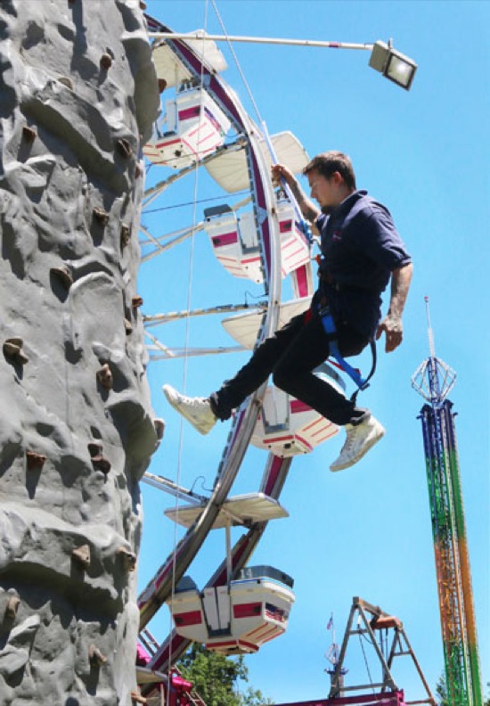 Skylar Walls rappels from the top of the Rock Wall at the Davis Shows Northwest at Riverside Park. He was testing the bell at the top of the climb to signal that someone actually reached the pinnacle. "It's a lot hotter up there than it is down here," Walls said after climbing all three faces.