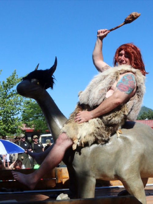 TIMOTHY BULLARD/Daily Courier A Caveman rides a dinosaur at the Boatnik Parade Saturday.