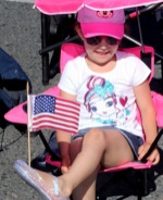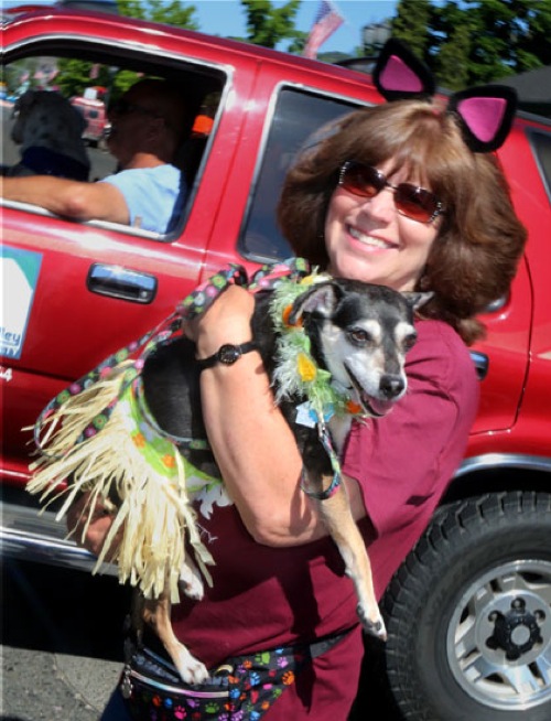TIMOTHY BULLARD/Daily Courier Connie Blanchard carries a mixed breed dog named Piper in the Humane Society entry at the Boatnik Parade Saturday.