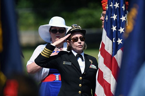 Diane Hoover, the director of Josephine County Public Health and a retired U.S. Navy captain, salutes during the singing of the national anthem at the Memorial Day service at Hillcrest Memorial Park on May 29. 2017 (Scott Stoddard / Daily Courier)