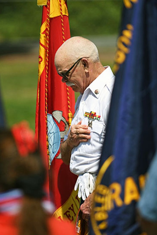 Patrick Oppelt of the Marine Corps League's Rogue Valley Detachment bows his head during the invocation at the Memorial Day service at Hillcrest Memorial Park on May 29. 2017 (Scott Stoddard / Daily Courier)