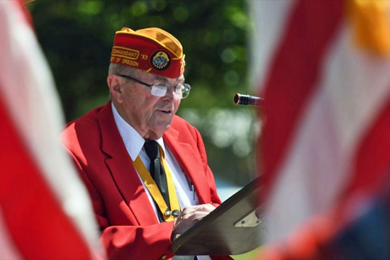 Master of ceremonies Jim Hale of the Marine Corps League reads the names of local veterans who passed away during 2016. The remembrance was part of the Memorial Day service at Hillcrest Memorial Park on May 29. 2017. (Scott Stoddard / Daily Courier)