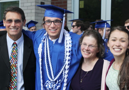 Caleb Maler with his parents and sister, Sarah, greet well-wishers at the conclusion of Caleb’s special graduation ceremony Friday at Grants Pass High School.