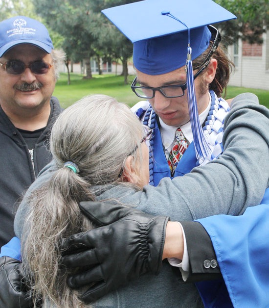 District 7 Superintendent Kirk Kolb chats with Elizabeth Maler at the conclusion of Caleb Maler’s special graduation ceremony Friday at Grants Pass High School.
