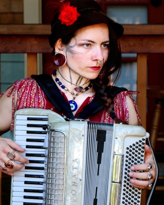 Aurelia Anne Cohen concentrates as she plays on her accordion with Jason O’Dea in Intuitive Compass at Saturday's Porchfest held in Northwest Grants Pass.