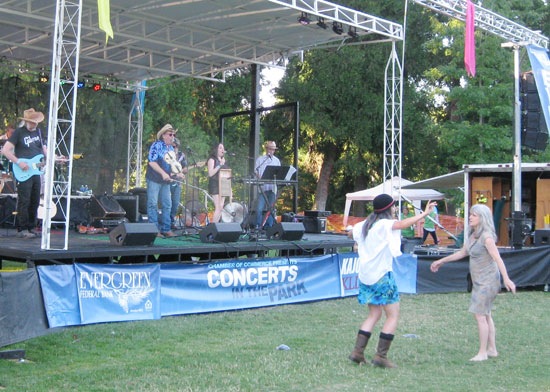 Dancers help kick-off the first Concerts in the Park event Tuesday evening at Riverside Park, featuring Etouffee, led by rockin' Cajun fiddler Kelly Thibodeaux.