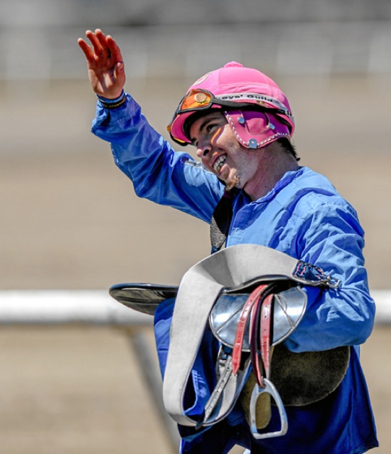 Photo by JOEL TAKARSH/for The Daily Courier PIC #0403 RACE #4 Winning jockey #3 waves to crowd