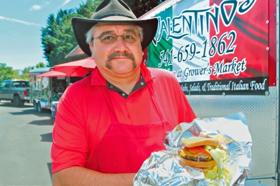 TIMOTHY BULLARD/Daily Courier Valentino's owner Brian Callahan shows off his Old Fashioned Cheeseburger and says, "We hope to expand and add new trucks, including in Astoria."