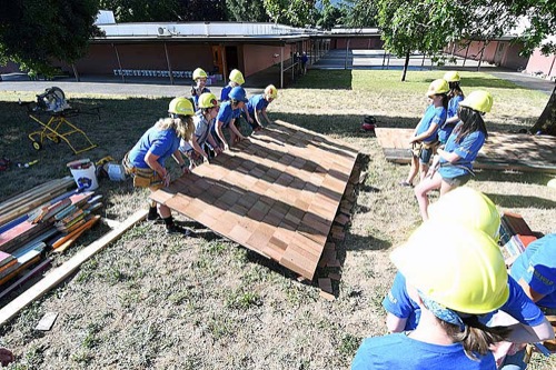 Scenes from the Girls Build camp at Lincoln Savage Middle School in Murphy on June 30, 2017. Girls Build Executive Director Katie Hughes, a graduate of Lincoln Savage and Hidden Valley High, said 42 girls between the ages of 8 and 13 participated in the five-day camp. Activities included carpentry, masonry, wiring, plumbing and painting, and a playhouse built by campers will be donated to the Women's Crisis Support Team's safe house. (Scott Stoddard/Daily Courier)