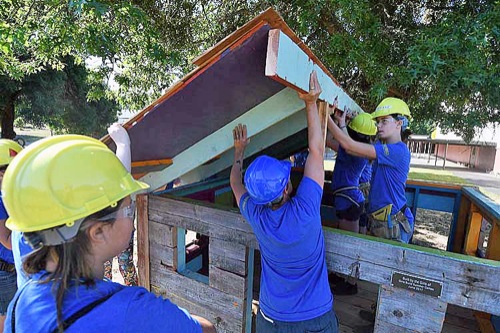 Scenes from the Girls Build camp at Lincoln Savage Middle School in Murphy on June 30, 2017. Girls Build Executive Director Katie Hughes, a graduate of Lincoln Savage and Hidden Valley High, said 42 girls between the ages of 8 and 13 participated in the five-day camp. Activities included carpentry, masonry, wiring, plumbing and painting, and a playhouse built by campers will be donated to the Women's Crisis Support Team's safe house. (Scott Stoddard/Daily Courier)