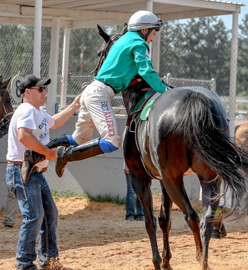 Photo by JOEL TAKARSH/for The Daily Courier Photo by JOEL TAKARSH/for The Daily Courier PIC #0526 Jockey Jake Samuels gets a leg-up