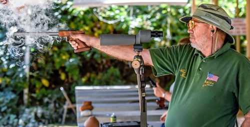 Photo by JOEL TAKARSH/for The Daily Courier PIC #0246 Alan Ross from Monterey, CA fires a black powder competition pistol