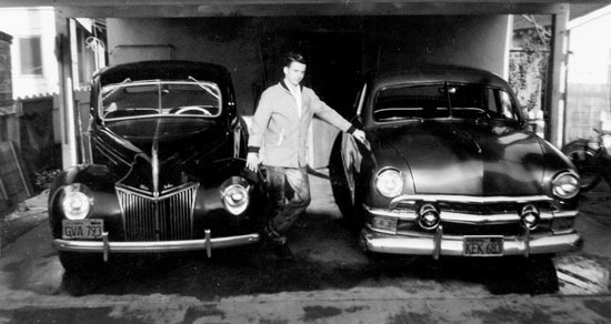 Thinking back 57 years ago, my first car, on the right, is my 1949 Ford sedan which was purchased from a high school friend who had fixed this car up so very nicely and painted it candy apple red, with tuck-n-roll and white hearts on the interior door panels.