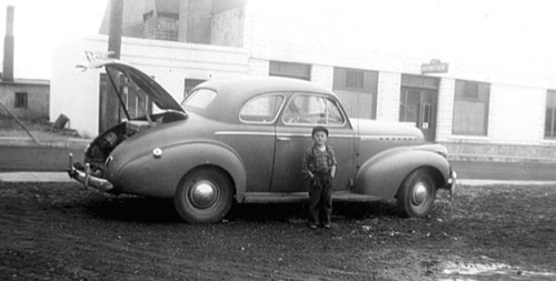 Here I am next to my first car, the family car, a 1940 Chevy coupe, in 1944. We lived in Williams, Ariz.