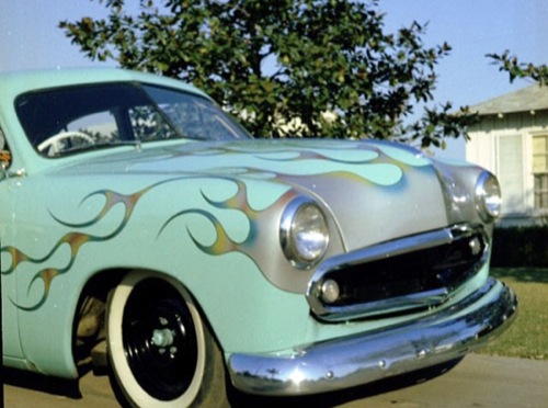 The next day I began by removing door handles, the hood ornament and the grill. Next I added rear lowering blocks and cut (welding torch) the front coil springs. Then, of course, I added headers and twin (loud) exhaust pipes. Once I finished the welding and lead work, I had it painted, added flames, and pin striping.
